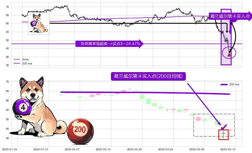 形态多维评估: ⚀ 2020-03-12-日显现 葛兰威尔均线 200日均线 第④买入点 下降趋势均值回复的短线反弹信号,后市看涨,买进信号