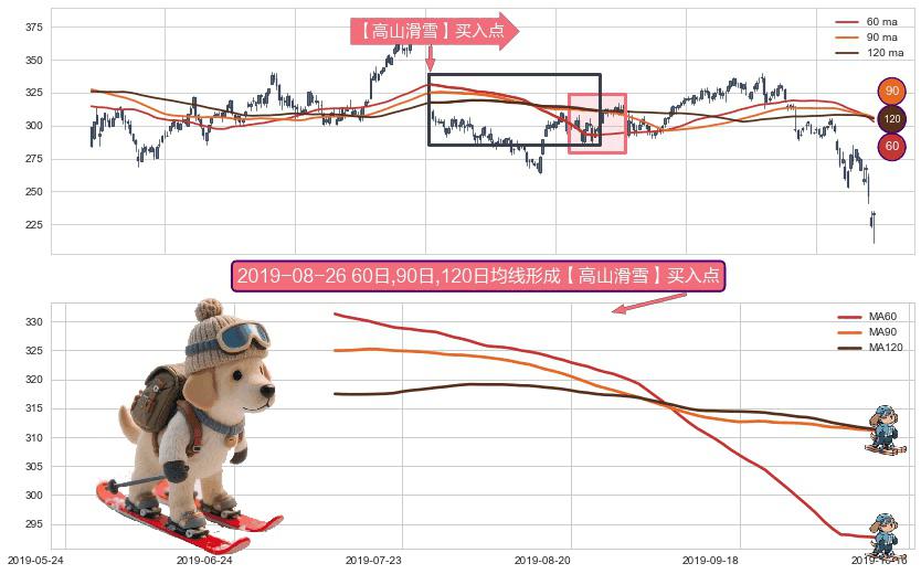 ⚀ 2019-07-11日-2019-10-10日显现 60日-90日-120日均线 【高山滑雪】买入点 看多信号,后市看涨,买入