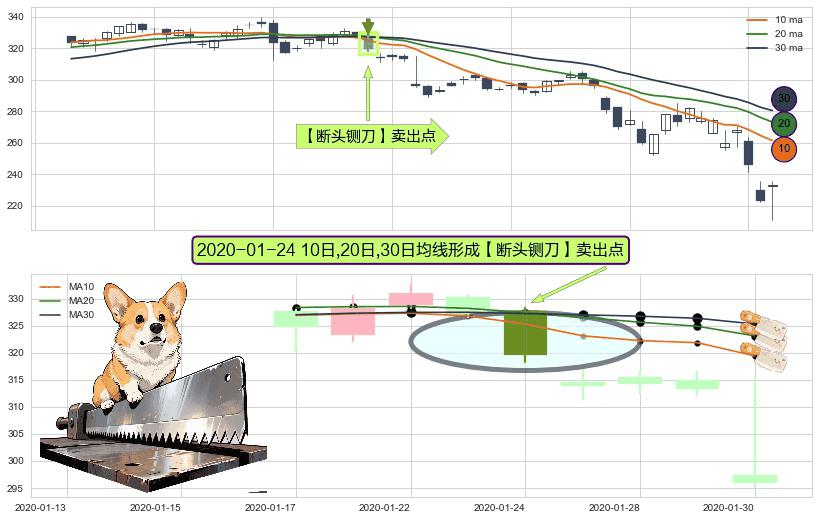 ⚀ 2020-01-24日显现 10日-20日-30日均线 【断头铡刀】卖出点 看空信号,后市看跌,卖出