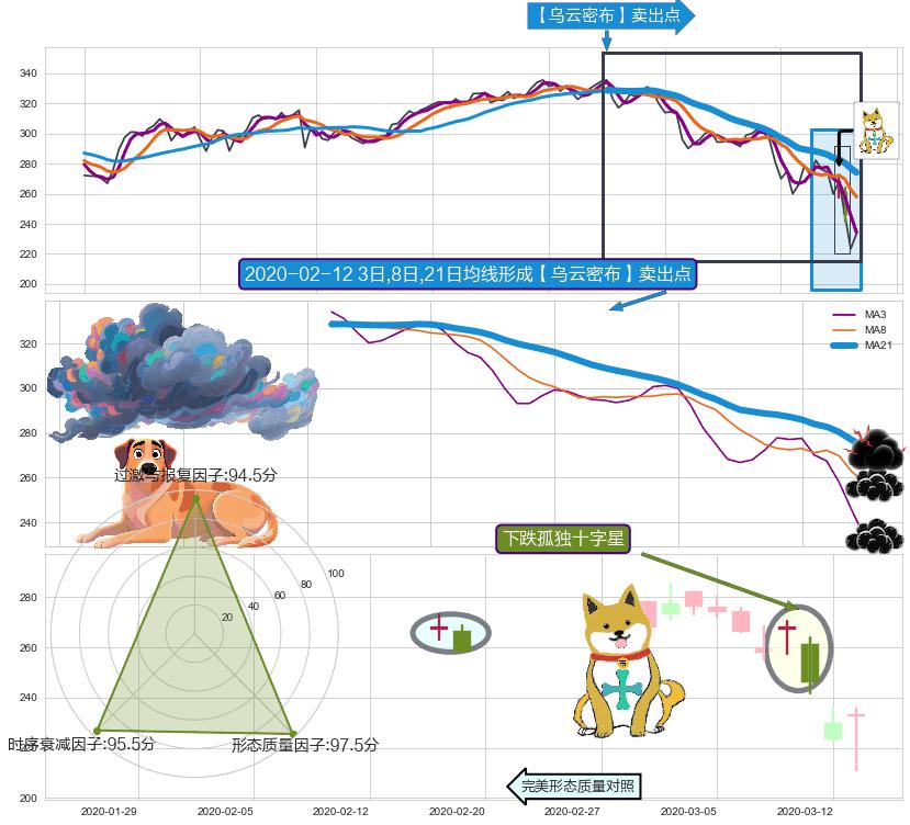 | 3 🅚:【死亡谷】卖出点 ➕ 📐:扩散三角反转下行突破支撑位破位, 猜想持续下沉下跌,被突破的支撑位已变为阻力位 ☞ 看空信号 ⇥ 【均线】交织【图形】⇥ 综合量化分数: 36 | > |