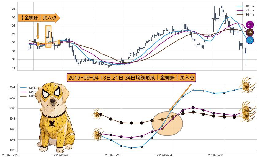 形态多维评估: ⚀ 2019-09-04日显现 13日-21日-34日均线 【金蜘蛛】买入点 看多信号,后市看涨,买入