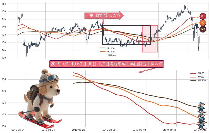 ⚂ 【银山谷】买入点 由MA60均线上穿MA90均线和MA120均线,MA90均线上穿MA120均线形成