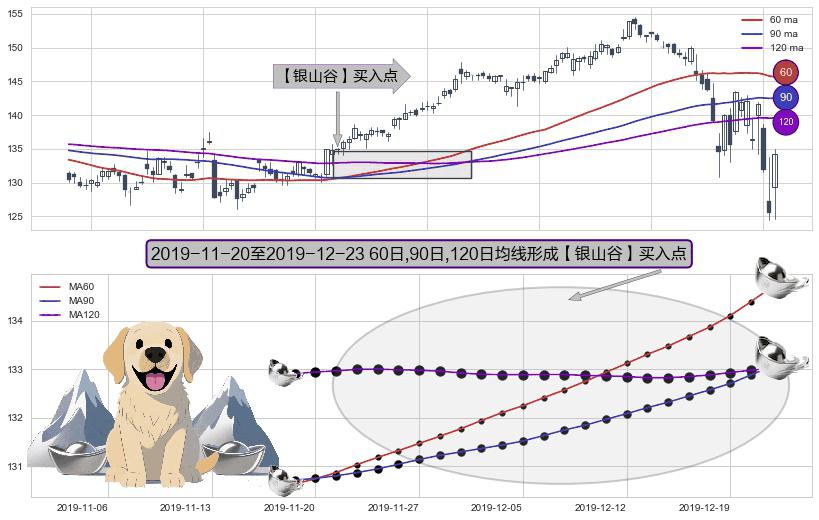 形态多维评估: ⚀ 2019-11-21-日至2019-12-23-日显现 60日-90日-120日均线 【银山谷】买入点 看多信号,后市看涨,买入