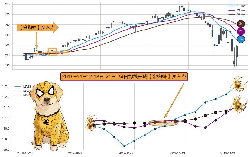 形态多维评估: ⚀ 2019-11-12日显现 13日-21日-34日均线 【金蜘蛛】买入点 看多信号,后市看涨,买入