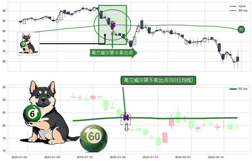 形态多维评估: ⚀ 2020-01-24-日显现 葛兰威尔均线 60日均线 第⑥卖出点 走势反转见顶信号,后市看跌,卖出信号