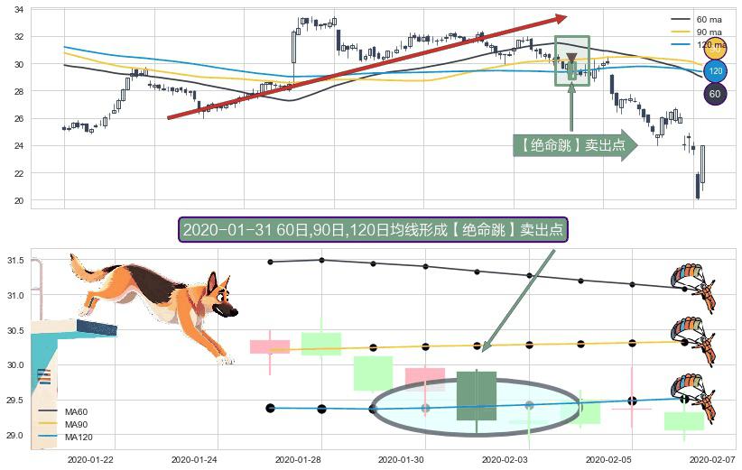形态多维评估: ⚀ 2020-01-31日显现 60日-90日-120日均线 【绝命跳】卖出点 看空信号,后市看跌,卖出