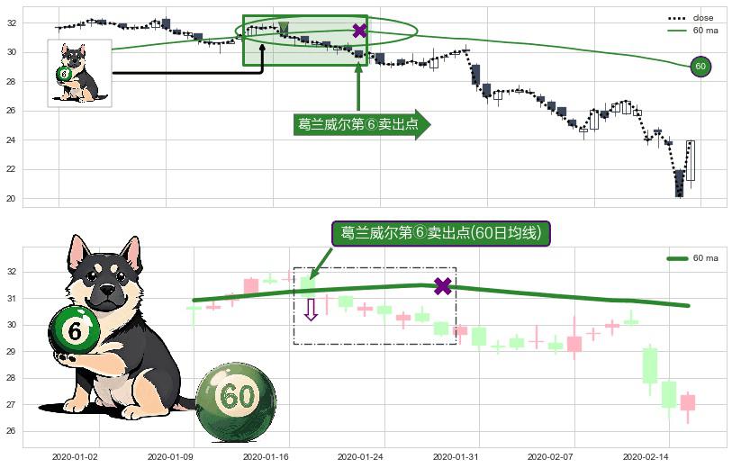 形态多维评估: ⚀ 2020-01-17-日显现 葛兰威尔均线 60日均线 第⑥卖出点 走势反转见顶信号,后市看跌,卖出信号