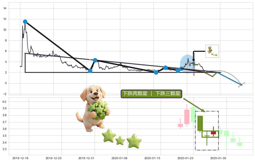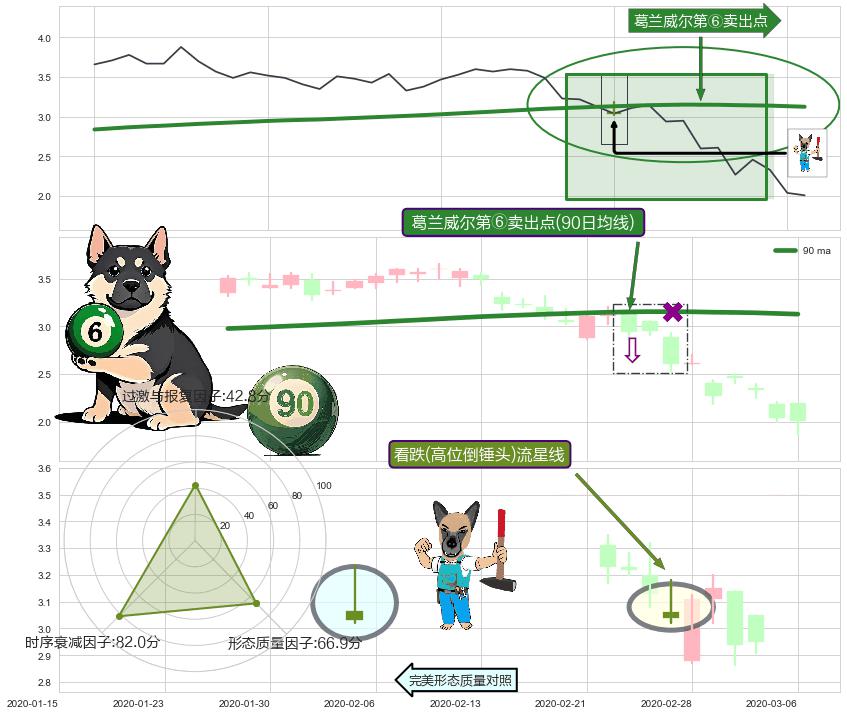 | 4 🅚:【绝命跳】卖出点 ➕ 📐:下降三角整理猜想突破点临近,临近关键支撑位,预期下沉突破下跌 ☞ 看空信号 ⇥ 【均线】交织【图形】⇥ 综合量化分数: 10 | > |