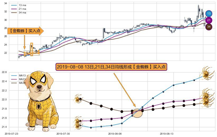 形态多维评估: ⚀ 2019-08-08日显现 13日-21日-34日均线 【金蜘蛛】买入点 看多信号,后市看涨,买入
