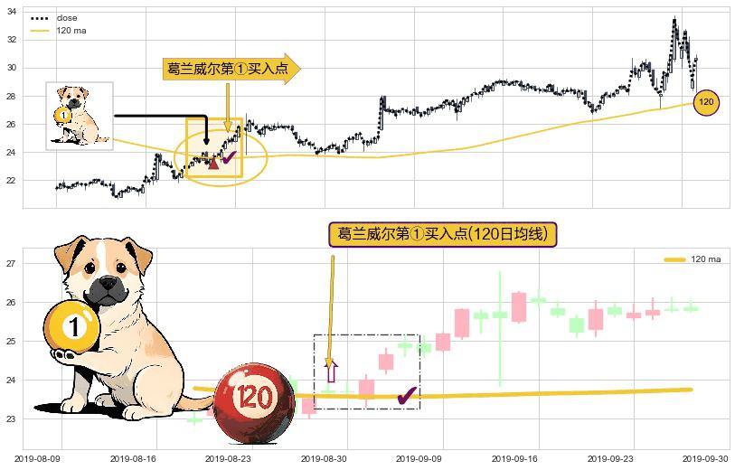 形态多维评估: ⚀ 2019-08-29-日显现 葛兰威尔均线 120日均线 第买①入点 走势反转见底信号,后市看涨,买进信号