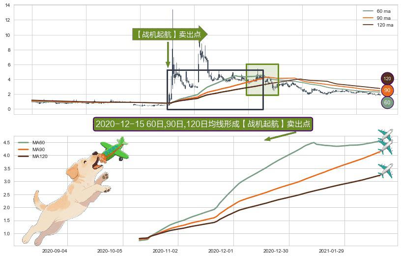 ⚀ 2020-10-13日-2021-02-18日显现 60日-90日-120日均线 【战机起航】卖出点 看空信号,后市看跌,卖出