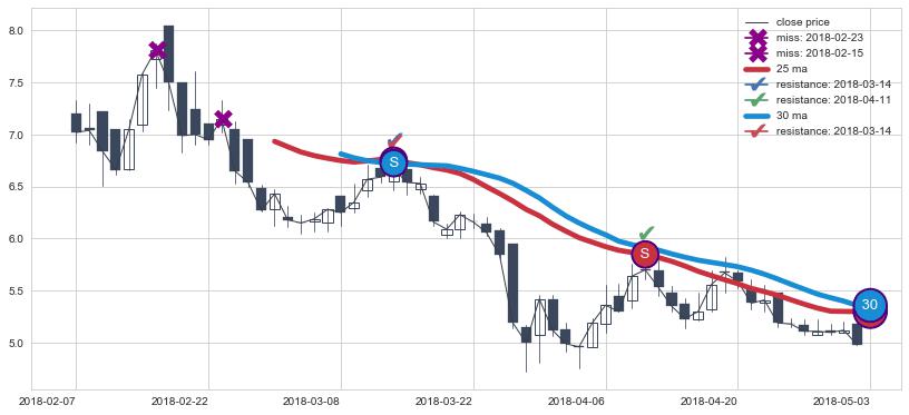 ⚀ 中期均线MA20下穿长期均线MA30形成的交叉是标准 死亡交叉