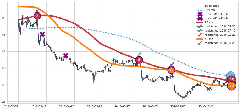 下跌趋势2018-02-02-2018-10-30,均线60, 95确认关键阻力3处
