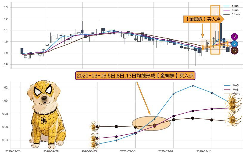 形态多维评估: ⚀ 2020-03-06日显现 5日-8日-13日均线 【金蜘蛛】买入点 看多信号,后市看涨,买入