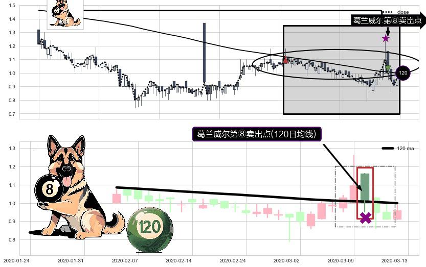 形态多维评估: ⚀ 2020-03-10-日显现 葛兰威尔均线 120日均线 第⑧卖出点 下降趋势的中继信号,后市看跌,卖出信号