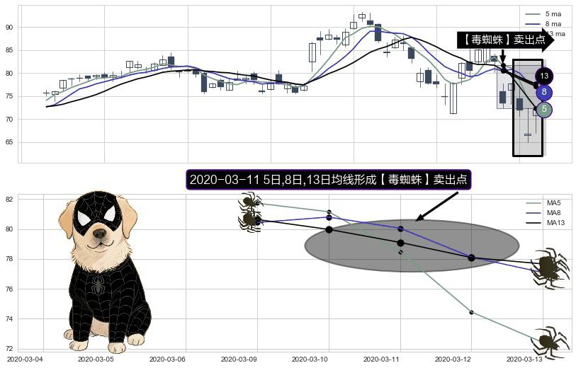 形态多维评估: ⚀ 2020-03-11日显现 5日-8日-13日均线 【毒蜘蛛】卖出点 看空信号,后市看跌,卖出
