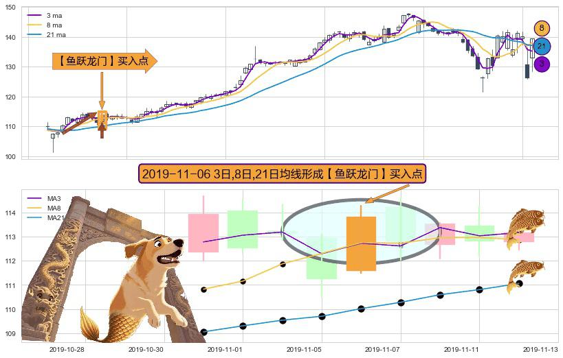 形态多维评估: ⚀ 2019-11-06日显现 3日-8日-21日均线 【鱼跃龙门】买入点 看多信号,后市看涨,买入