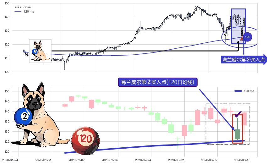 形态多维评估: ⚀ 2020-03-12-日显现 葛兰威尔均线 120日均线 第②买入点 上升趋势的中继信号,后市看涨,买进信号