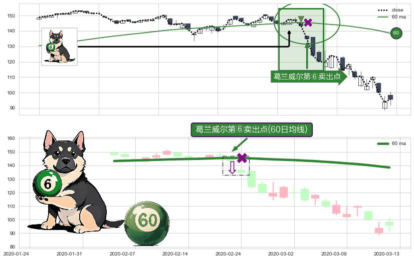 形态多维评估: ⚀ 2020-02-21-日显现 葛兰威尔均线 60日均线 第⑥卖出点 走势反转见顶信号,后市看跌,卖出信号