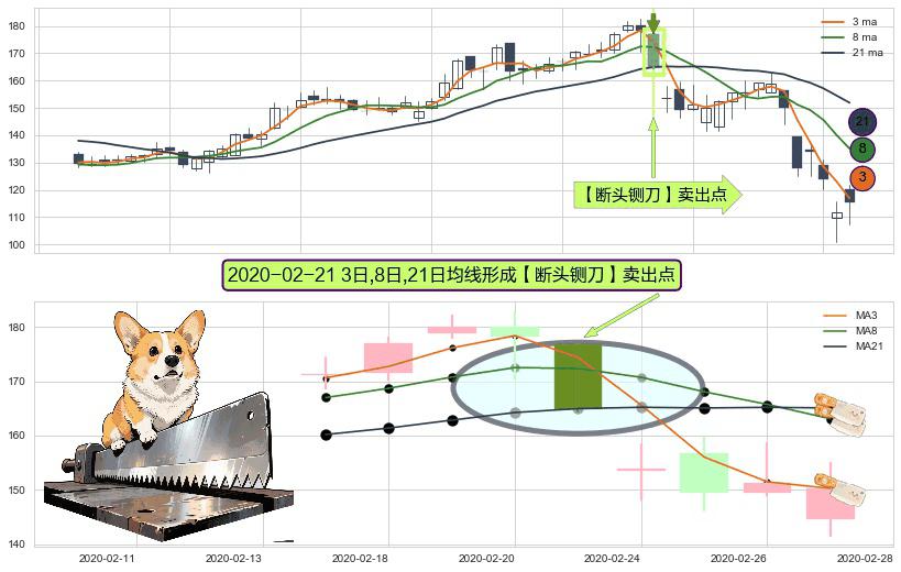 ⚀ 2020-02-21日显现 3日-8日-21日均线 【断头铡刀】卖出点 看空信号,后市看跌,卖出