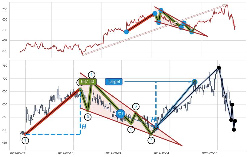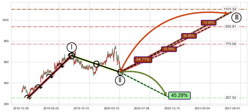 ➢ AI预测: 假定反转启动后, 第❷目标位置(2020-12-21, 615.57)