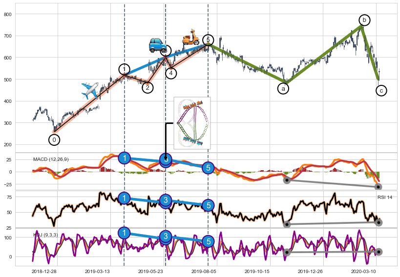 ➢ 1,3,5驱动浪MACD, RSI, KDJ走势都出现【常规背离】反转信号增强