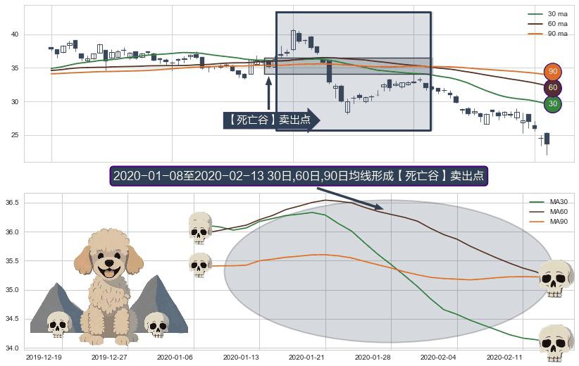 ⚂ 【死亡谷】卖出点 由MA30均线下穿MA60均线和MA90均线,MA60均线下穿MA90均线形成