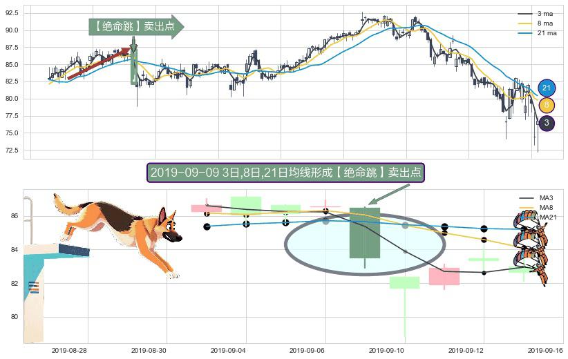 形态多维评估: ⚀ 2019-09-09日显现 3日-8日-21日均线 【绝命跳】卖出点 看空信号,后市看跌,卖出