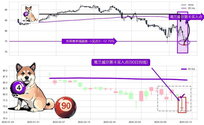 形态多维评估: ⚀ 2020-03-12-日显现 葛兰威尔均线 90日均线 第④买入点 下降趋势均值回复的短线反弹信号,后市看涨,买进信号