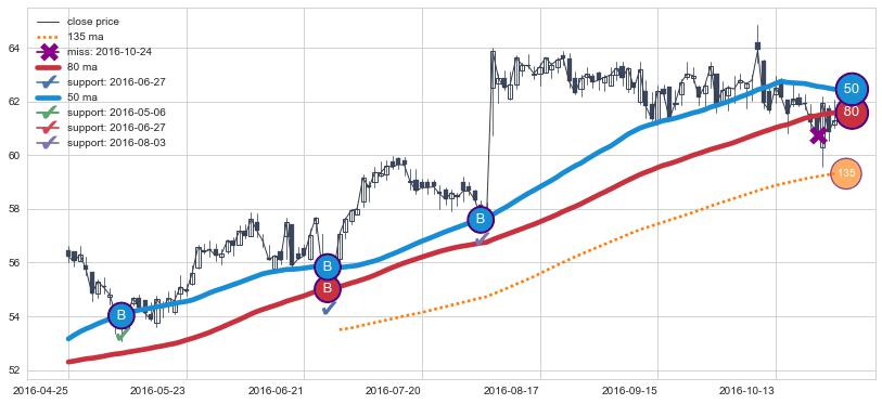 上涨趋势2016-04-25-2016-10-27,均线80, 50确认关键支撑3处