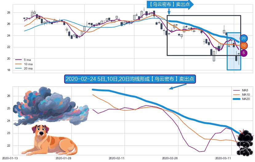 形态多维评估: ⚀ 2020-02-03日-2020-03-13日显现 5日-10日-20日均线 【乌云密布】卖出点 看空信号,后市看跌,卖出