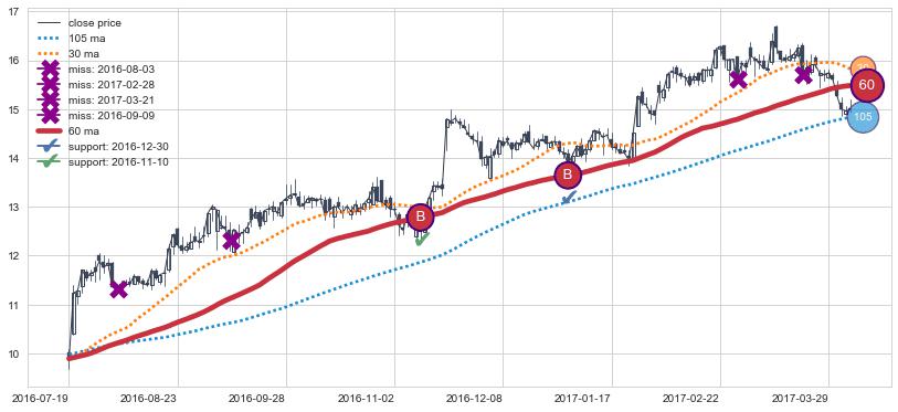 上涨趋势2016-07-19-2017-04-05,均线60确认关键支撑2处
