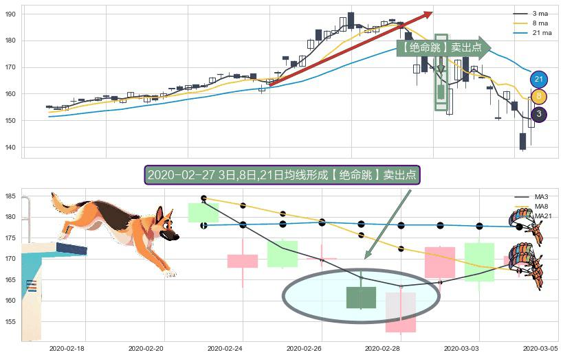 ⚀ 2020-02-27日显现 3日-8日-21日均线 【绝命跳】卖出点 看空信号,后市看跌,卖出