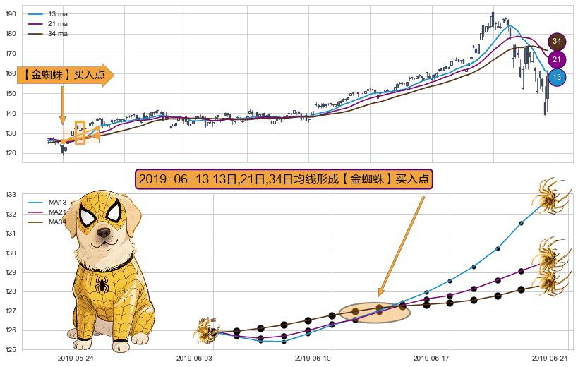 ⚀ 2019-06-13日显现 13日-21日-34日均线 【金蜘蛛】买入点 看多信号,后市看涨,买入