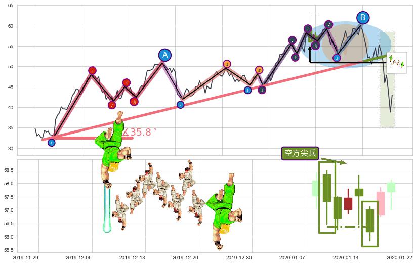 ➣ 收盘价(2020-01-28: 56.47 )→回踩→第二根k线高点(2020-01-27: 55.99 )