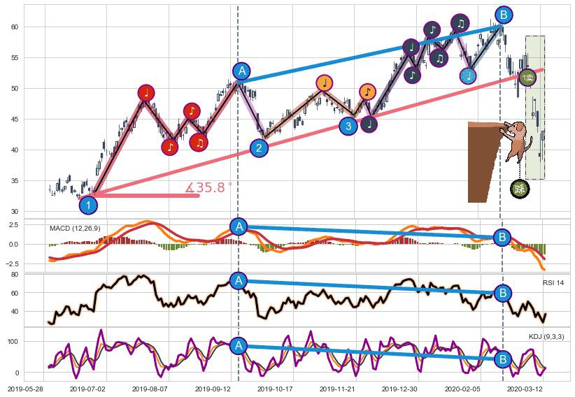 ➣ 【KDJ】上升趋势出现【常规背离 & 反转信号】背离程度53.94%,背离夹角角度40.8˚,背离程度较大