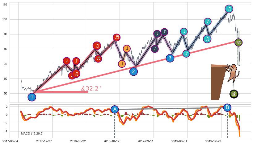 ➣ 2017-10-12-2020-03-11上升趋势存在反转[风险],其原上升趋势的支撑位(85.66)已破位[强阻力信号],原上升趋势角度: 32.2˚