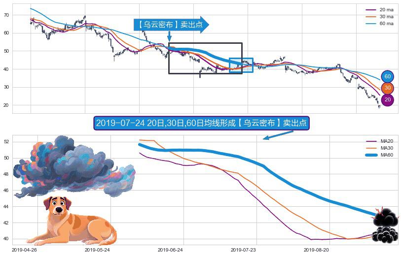 ⚃ 【乌云密布】卖出点长时间对 牛 市转 熊 市进行确认,且均线压制价格走势,但信号发出时间较长,属于【迟滞】看空卖出信号