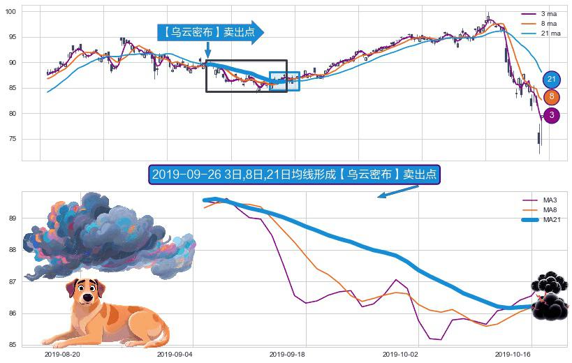 形态多维评估: ⚀ 2019-09-05日-2019-10-17日显现 3日-8日-21日均线 【乌云密布】卖出点 看空信号,后市看跌,卖出