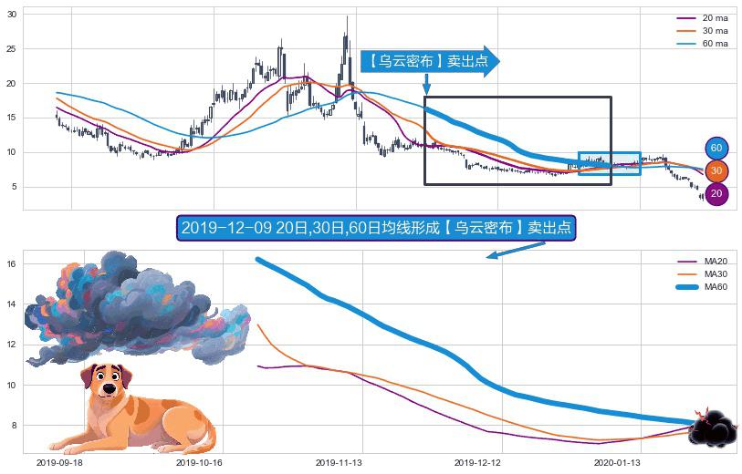 ⚀ 2019-10-23日-2020-01-27日显现 20日-30日-60日均线 【乌云密布】卖出点 看空信号,后市看跌,卖出