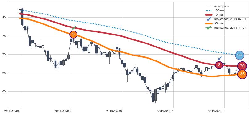 下跌趋势2016-11-15-2017-07-19,均线100, 70确认关键阻力4处