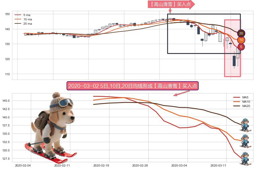 ⚀ 2020-02-14日-2020-03-13日显现 5日-10日-20日均线 【高山滑雪】买入点 看多信号,后市看涨,买入
