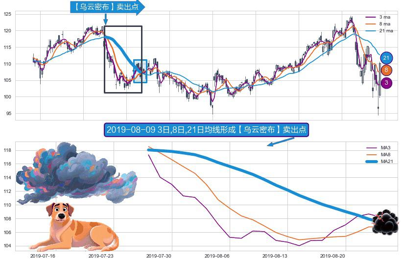 形态多维评估: ⚀ 2019-07-26日-2019-08-23日显现 3日-8日-21日均线 【乌云密布】卖出点 看空信号,后市看跌,卖出