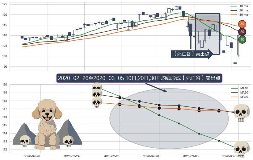⚂ 【死亡谷】卖出点 由MA10均线下穿MA20均线和MA30均线,MA20均线下穿MA30均线形成