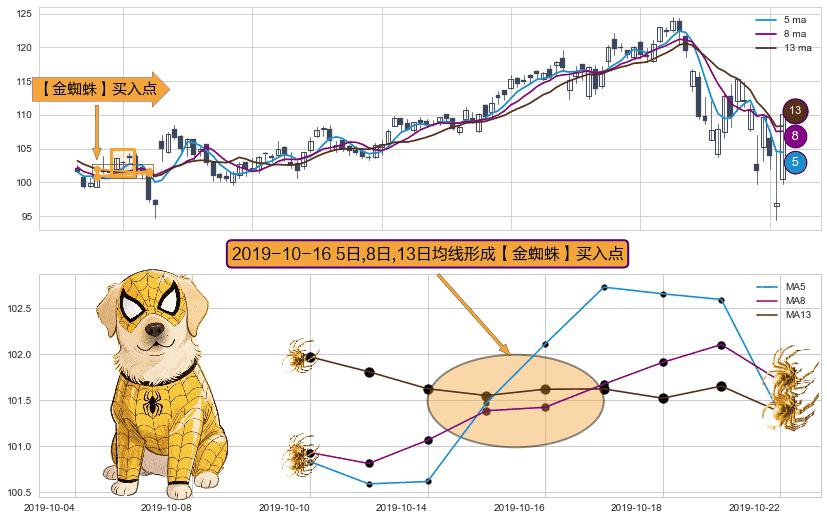形态多维评估: ⚀ 2019-10-16日显现 5日-8日-13日均线 【金蜘蛛】买入点 看多信号,后市看涨,买入
