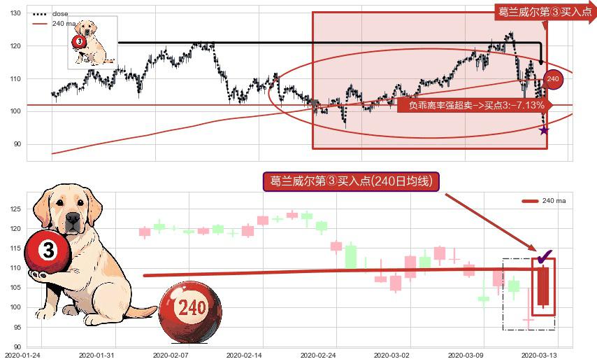 形态多维评估: ⚀ 2020-03-13-日显现 葛兰威尔均线 240日均线 第③买入点 上升趋势的中继信号,后市看涨,买进信号