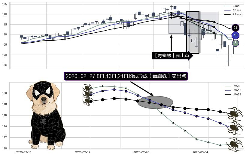 形态多维评估: ⚀ 2020-02-27日显现 8日-13日-21日均线 【毒蜘蛛】卖出点 看空信号,后市看跌,卖出