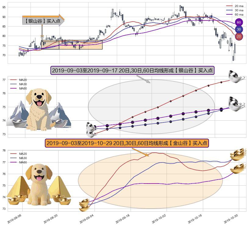 ⚂ 2019-09-04-日至2019-10-29-日显现 20日-30日-60日均线 【金山谷】买入点 其再次确认了买入信号,可靠性更强,买入