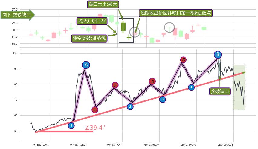 ➣ 2019-01-29-2020-03-11上升趋势存在反转[风险],其原上升趋势的支撑位(87.61)已破位[强阻力信号],原上升趋势角度: 39.4˚