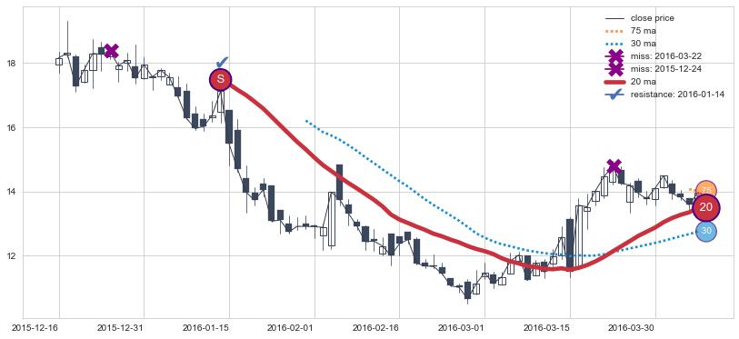 下跌趋势2015-12-16-2016-04-06,均线20确认关键阻力1处